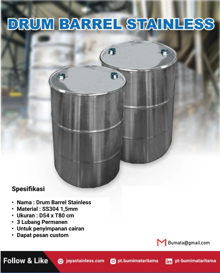 Drum dan ember stainless adalah wadah berbentuk silinder yang terbuat dari bahan stainless steel, digunakan untuk menyimpan, mengangkut, atau mengolah berbagai jenis bahan, baik cair, padat, maupun semi-padat. Bahan stainless steel dipilih karena sifatnya yang tahan karat, kuat, tahan terhadap suhu ekstrem, serta mudah dibersihkan, sehingga sangat cocok untuk berbagai aplikasi, terutama dalam industri makanan, minuman, farmasi, kimia, dan manufaktur.