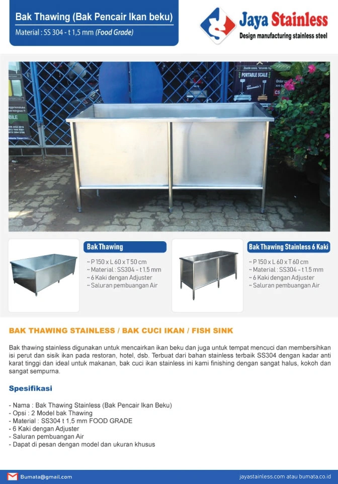 Bak ini hadir dengan desain ergonomis dan kapasitas beragam, memungkinkan pengguna untuk mencairkan bahan makanan dalam jumlah besar sekaligus. Permukaan interiornya halus dan bebas pori, sehingga tidak menyerap bau atau kotoran, serta meminimalkan risiko kontaminasi. Proses thawing lebih cepat dan efisien karena material stainless steel memiliki kemampuan penghantaran suhu yang baik, membantu bahan makanan mencair secara merata.