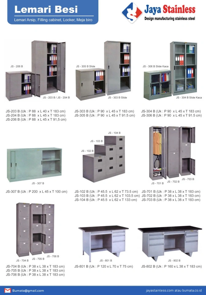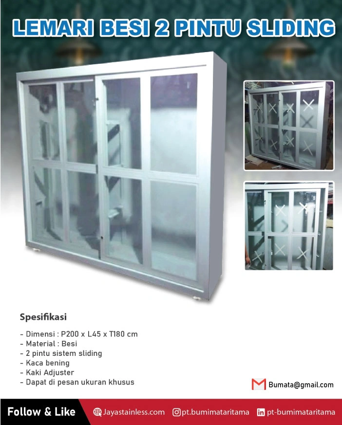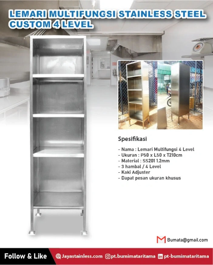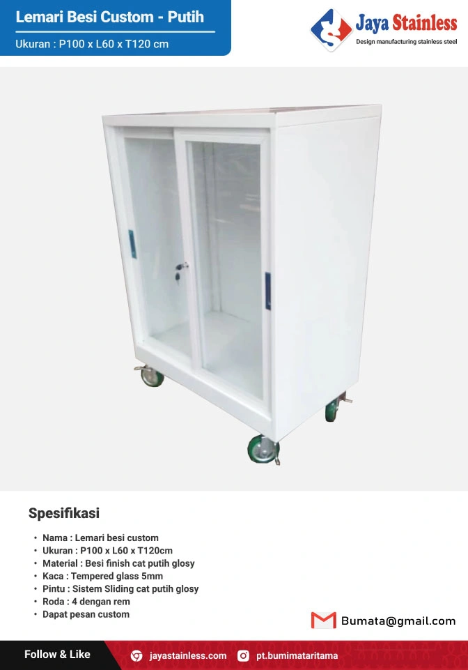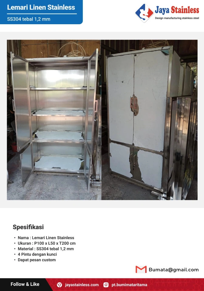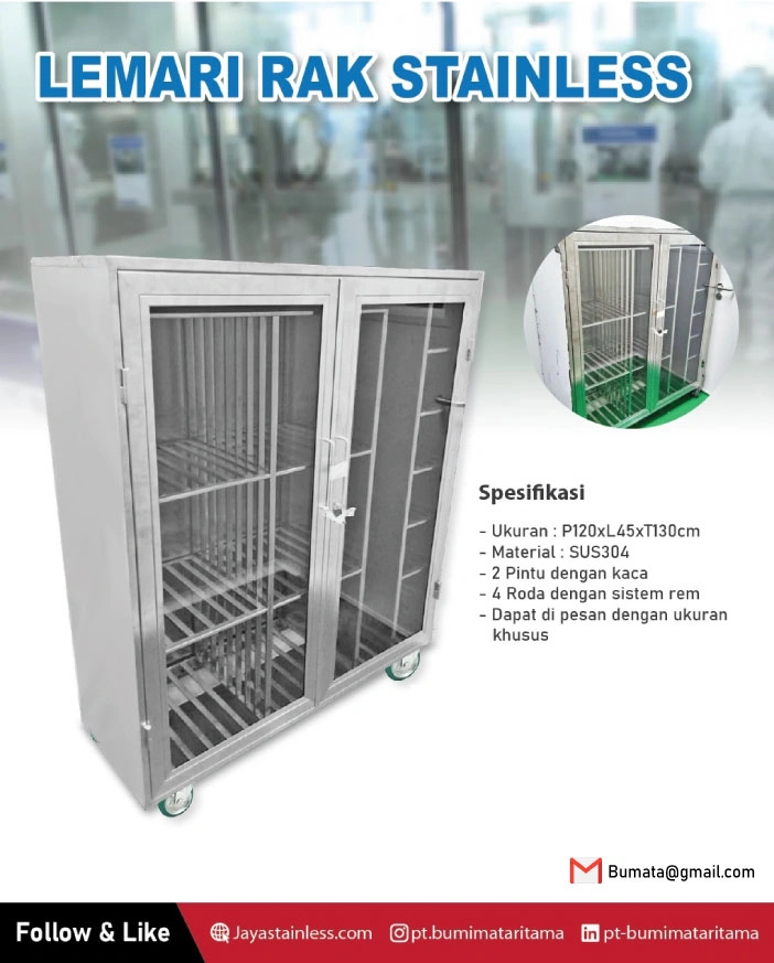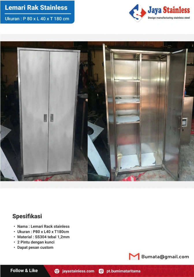 Kami menjual cabinet stainless dan menerima order lemari cabinet dengan desain khusus, selain stainless kami juga menjual cabinet dengan bahan full besi atau kombinasi stainless dan besi. Hubungi kami melalui email di [email protected]