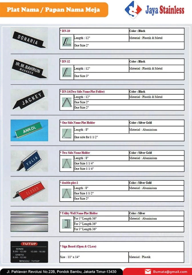 Tersedia dalam berbagai ukuran dan desain, mulai dari yang berbentuk datar hingga yang memiliki dudukan kecil. Beberapa model dilengkapi dengan klip atau slot untuk memasukkan kartu keterangan, sementara yang lain memiliki permukaan halus yang bisa diukir atau dilabeli secara permanen.
