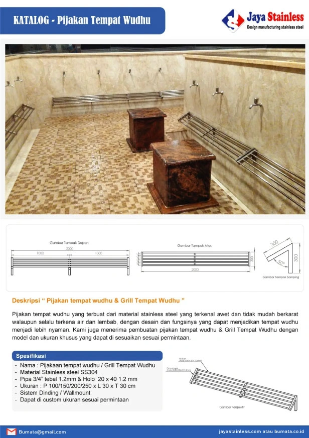 Stainless steel memiliki kualitas yang berbeda pastikan anda mendapatkan produk Pijakan kaki tempat wudhu dengan harga dan kualitas terbaik hanya di jayastainless.com. Hubungi kami di email [email protected].