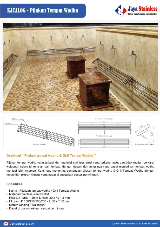 Stainless steel memiliki kualitas yang berbeda pastikan anda mendapatkan produk Pijakan kaki tempat wudhu dengan harga dan kualitas terbaik hanya di jayastainless.com. Hubungi kami di email [email protected].