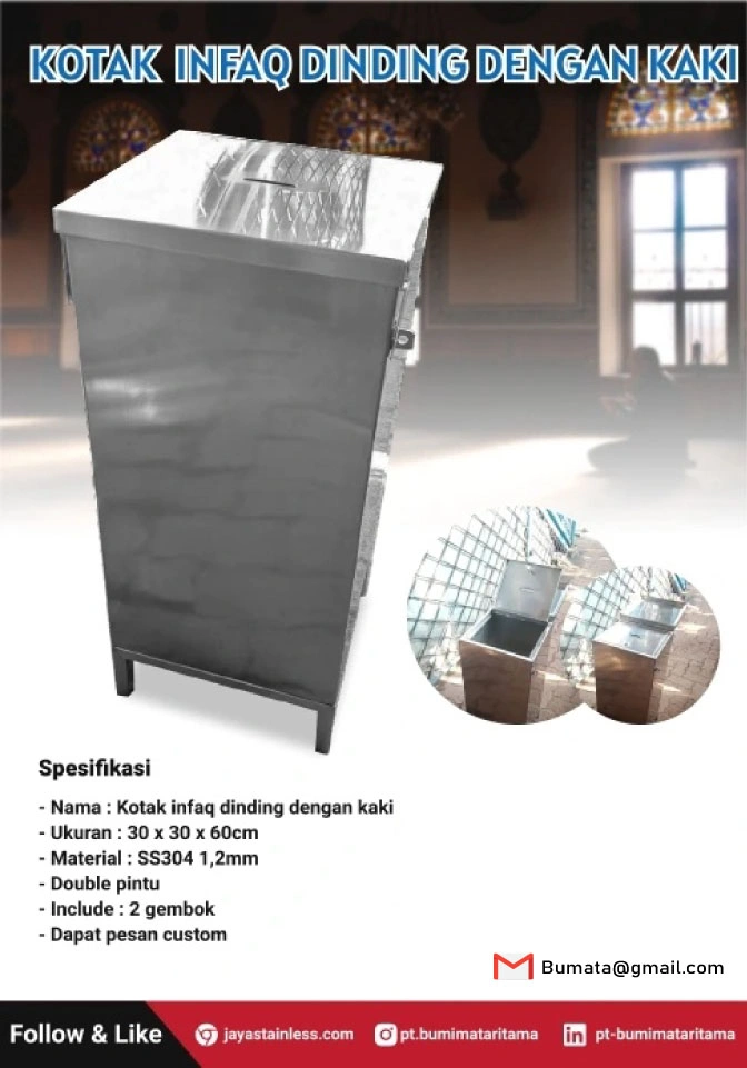 Stainless steel memiliki kualitas yang berbeda dapatkan Kotak infaq dengan harga dan kualias terbaik hanya di Jayastainless.com. Kotak Amal Masjid yang terbuat dari material stainless steel yang terkenal awet dan tidak mudah berkarat. Pesan cepat melalui email [email protected].