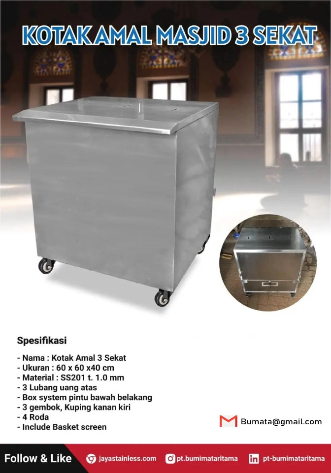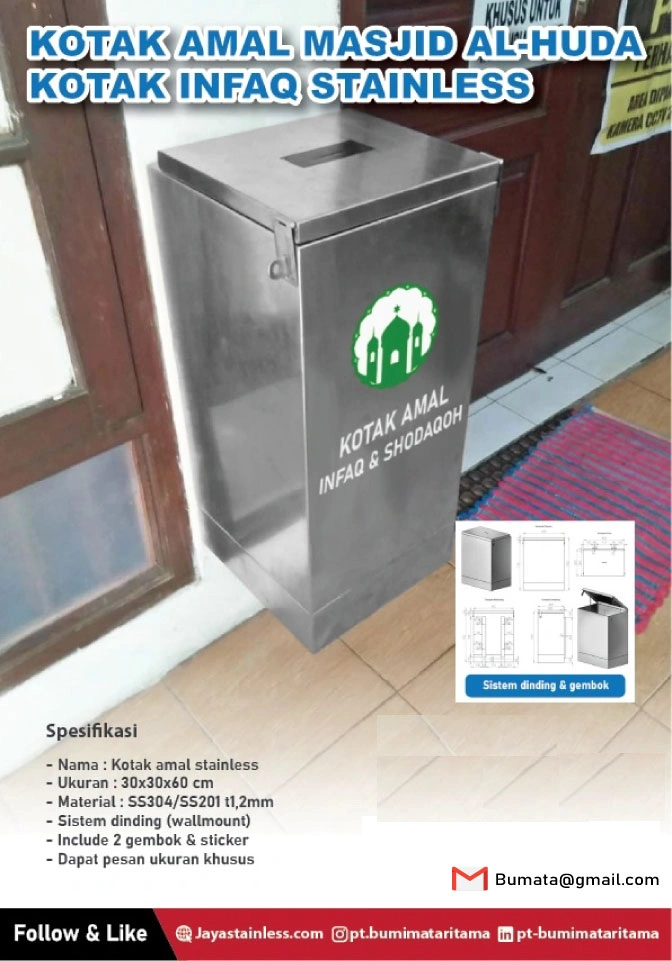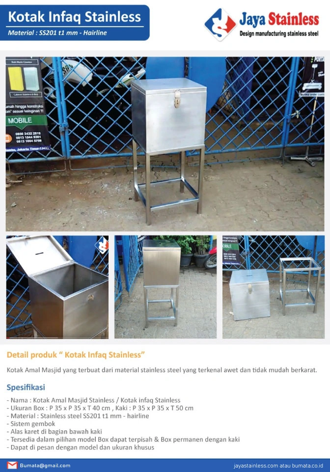 Stainless steel memiliki kualitas yang berbeda dapatkan Kotak infaq dengan harga dan kualias terbaik hanya di Jayastainless.com. Kotak Amal Masjid yang terbuat dari material stainless steel yang terkenal awet dan tidak mudah berkarat. Pesan cepat melalui email [email protected].