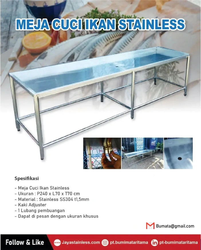 Meja cuci ikan stainless steel asli dengan grade terbaik diproduksi dengan finishing sempurna, hasil pengelasan yang halus dari pekerja kami yang berpengalaman.