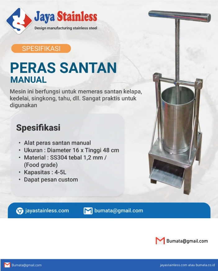 Mesin Peras Santan Manual adalah alat praktis yang dirancang untuk membantu proses pemerasan santan dari kelapa parut secara mudah dan efisien tanpa menggunakan tenaga listrik. Mesin ini menjadi solusi tepat bagi kebutuhan rumah tangga, usaha kecil, atau bisnis kuliner yang mengutamakan produksi santan segar. Terbuat dari bahan berkualitas, seperti stainless steel atau logam kuat lainnya, mesin ini tidak hanya tahan lama tetapi juga aman digunakan untuk kontak dengan makanan.