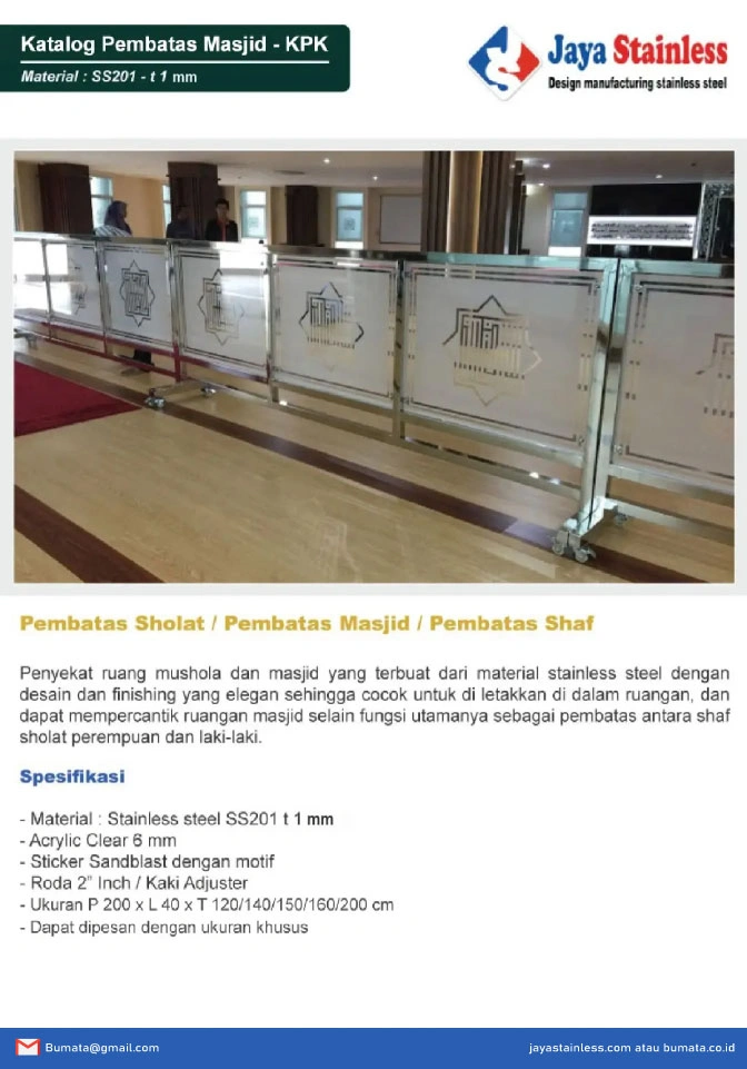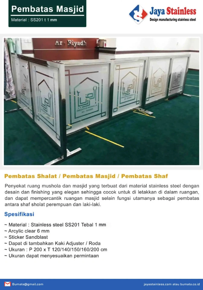 Penyekat Ruang Stainless (Pembatas Masjid) , Stainless steel memiliki kualitas yang berbeda pastikan anda mendapatkan produk “Penyekat Ruang / pembatas ruang masjid dan mushola” dengan harga dan kualitas terbaik hanya di jayastainles.com.