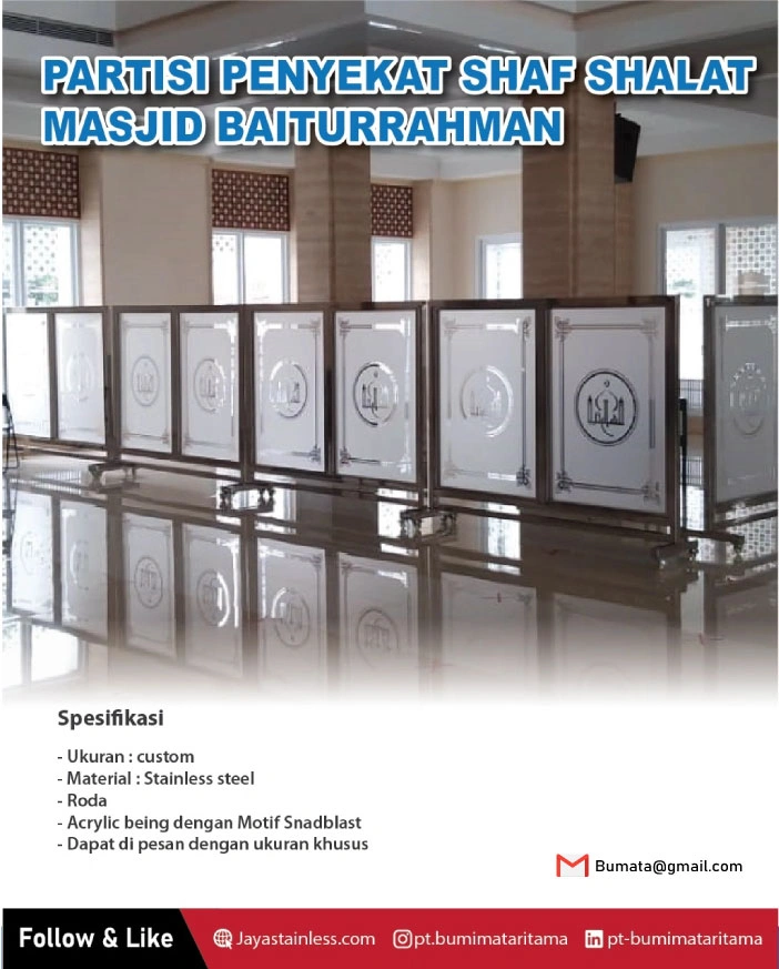 Partisi stainless sering dirancang dengan pola-pola islami yang menambah nilai estetika ruang masjid.