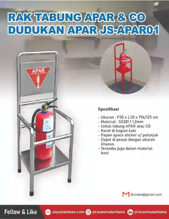 Rak apar stainless adalah tempat menyimpan alat pemadam api ringan untuk kondisi darurat dalam mengantisipasi kebakaran yang umumnya diletakkan pada dinding tembok ataupun berdiri dalam beberapa area yang potensial untuk terpacu terjadinya kebakaran seperti di dalam kantor, mall, dapur, restoran, bank, rumah sakit, hingga rumah tinggal. Dengan adanya box tabung apar ini menjadikan alat pemadam api ringan menjadi lebih rapih, aman dan mudah ditemukan dengan cepat jika terjadi indikasi kebakaran.