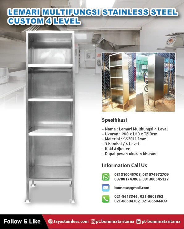 berbahan stainless steel mampu menahan beban berat, sehingga cocok digunakan untuk menyimpan berbagai barang, mulai dari peralatan dapur, alat berat, hingga dokumen penting di kantor. Keunggulan ini membuatnya ideal untuk penggunaan jangka panjang.