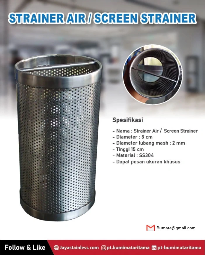 Kami menjual dan memproduksi  Saringan Air  /  Saringan Saringan /  Saringan Industri  berfungsi untuk menyaring kotoran berupa ‘kotoran, kerak’ ataupun kotoran yang terbawa oleh saluran, Screen Stainer ini terbuat dari bahan stainless steel sehingga tidak mudah berkarat. dan mudah dibersihkan.