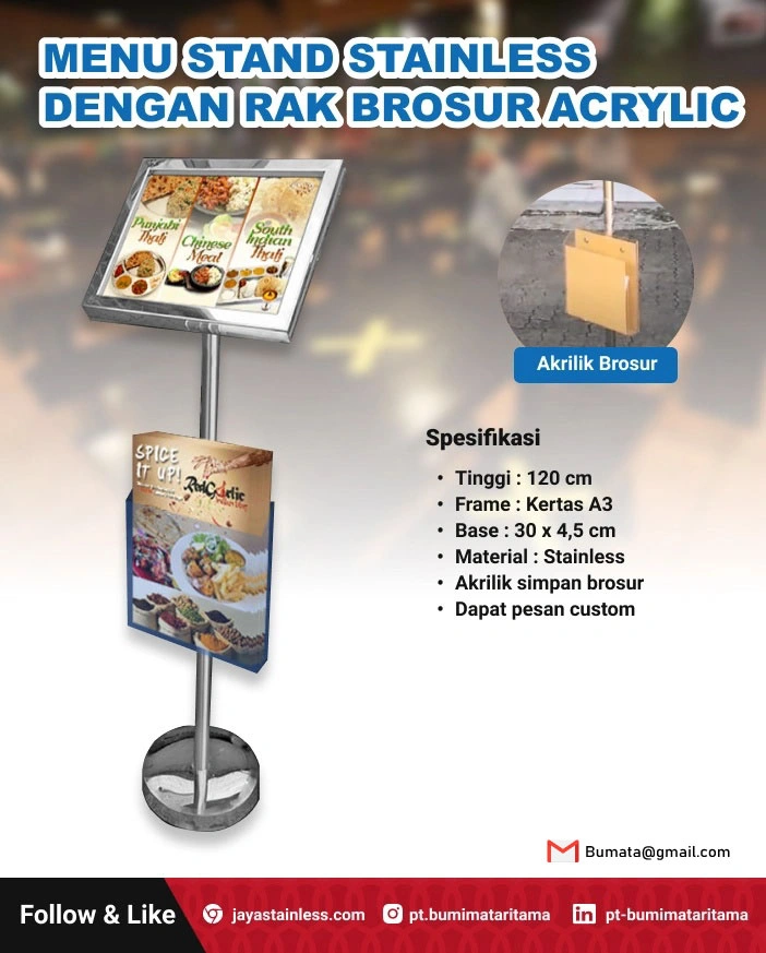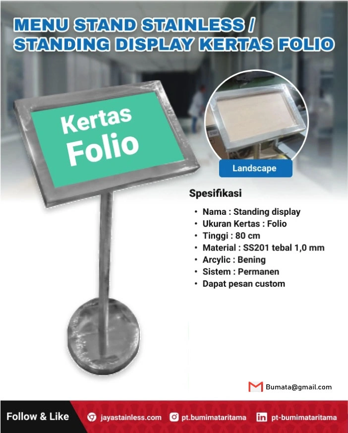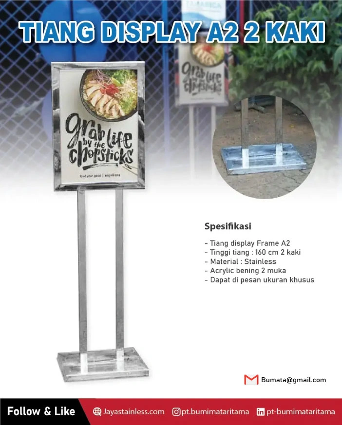[email protected]Papan display yang mampu memudahkan informasi merupakan suatu media yang paling dicari dan diminati dalam dunia industri, maka dari itulah kami memproduksi tiang display stainless steel sebagai media penyalur pesan visual yang efektif. Penggunaan tiang display stainless terbilang sangat diminati terutama dalam industri perbankan, transportasi, dan penyedia makanan saji. Meski begitu masih banyak lagi pengguna tiang display stainless lainnya seperti perkantoran, hotel, mall, supermarket, hingga pertokoan.