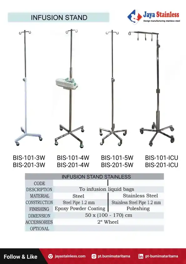 Jaya Stainless memproduksi Tiang Infus dengan desain standar dan rumit dengan dilengkapi penambahan roda pada bagian bawahnya, juga didesain dengan 2 pengait untuk menggantungkan cairan infus yang dibutuhkan pasien. Umumnya yang kami produksi adalah dengan material 100% full stainless steel dengan kualitas terbaik atau standar peralatan rumah sakit agar menjaga produk tetap steril, kokoh, dan lebih tahan korosi.