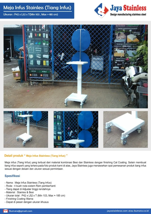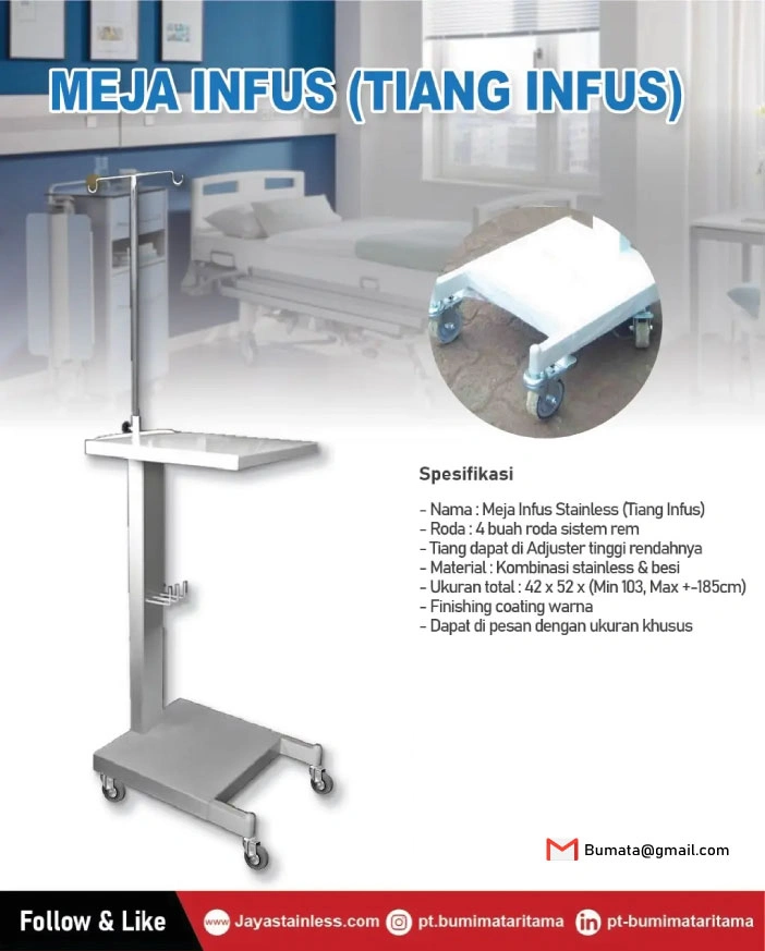 Stainless steel memiliki kualitas yang berbeda, pastikan anda mendapatkan produk Tiang Infus Stainless – Besi dengan kualitas terbaik dan juga bisa custom desain hingga ukuran sesuai kebutuhan Order di [email protected].