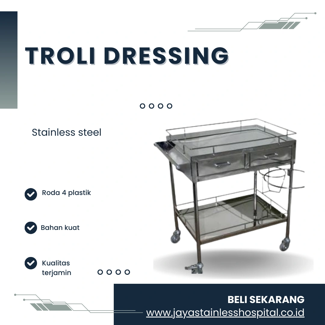 Troli dressing atau troli perawatan luka adalah alat medis yang dirancang khusus untuk memudahkan tenaga medis dalam melakukan perawatan luka pada pasien. Ini berfungsi sebagai tempat penyimpanan dan transportasi berbagai peralatan medis yang dibutuhkan dalam proses perawatan luka.