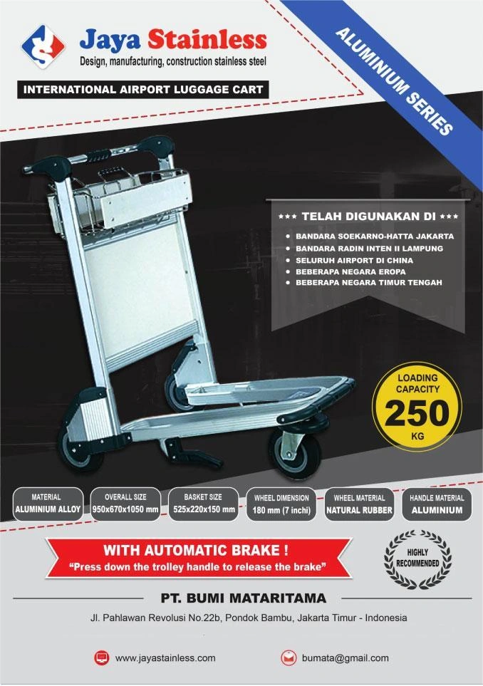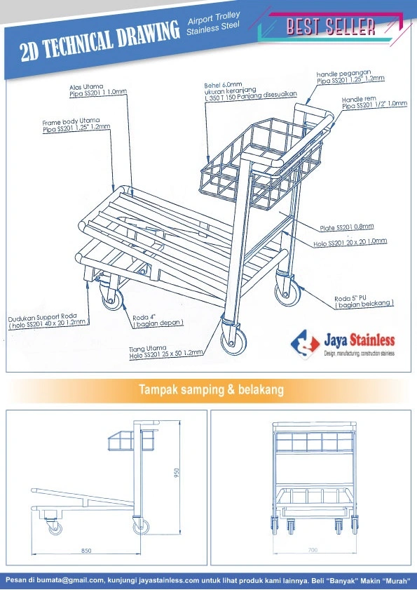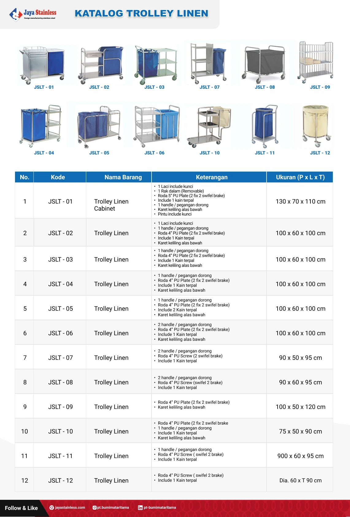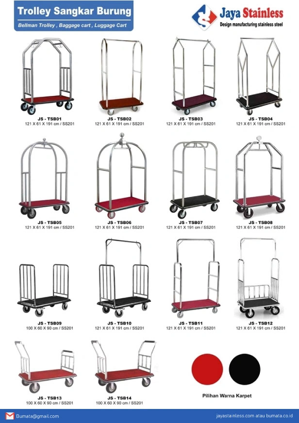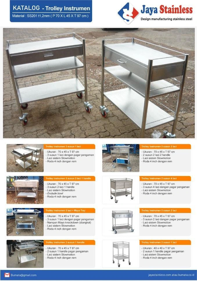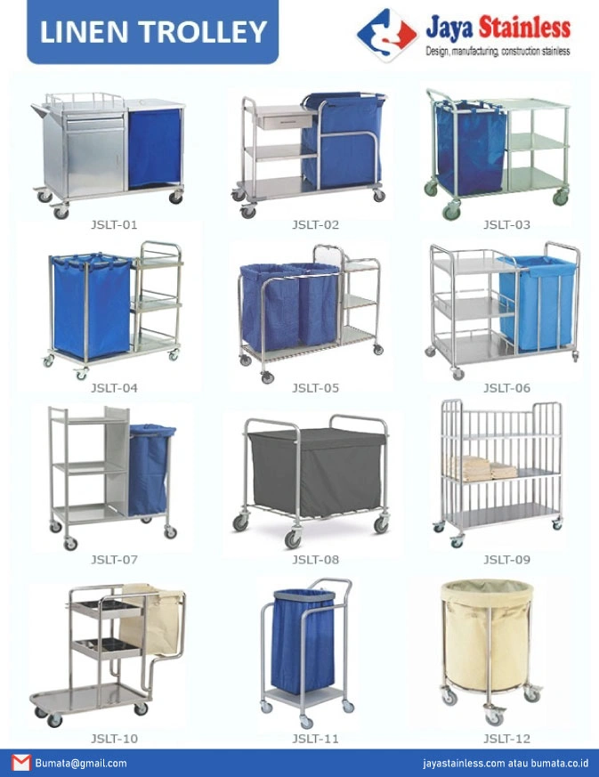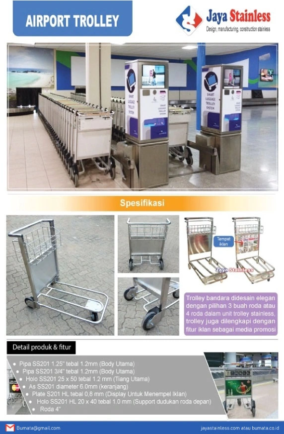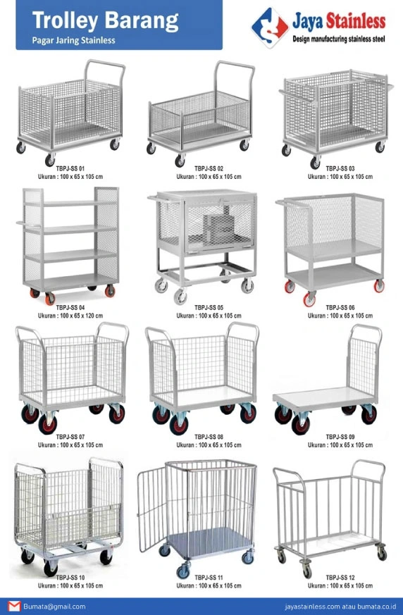 Jaya Stainless menjual trolley stainless mulai dari satuan, seperti trolley bandara, trolley barang (handtruck), food warmer trolley, food service trolley, dan trolley dengan desain custom. Kami menjual trolley stainless dan trolley besi mulai dari satuan hingga permintaan masal seperti trolley bandara, trolley barang (handtruck), food warmer, food service trolley, dan trolley dengan desain custom. Kami telah mensupport pengadaan trolley sejak tahun 2000 untuk sebagian besar rumah sakit, hotel, pabrik di Indonesia.