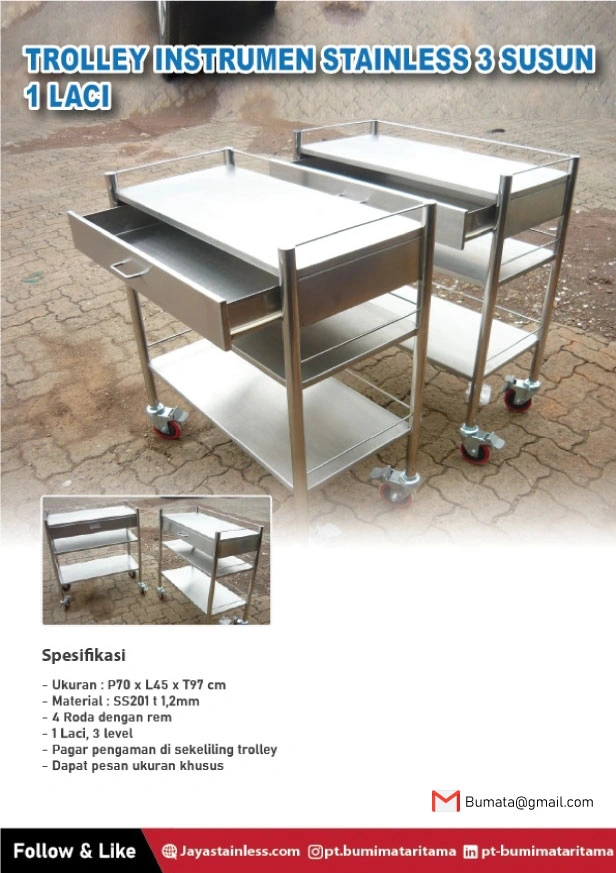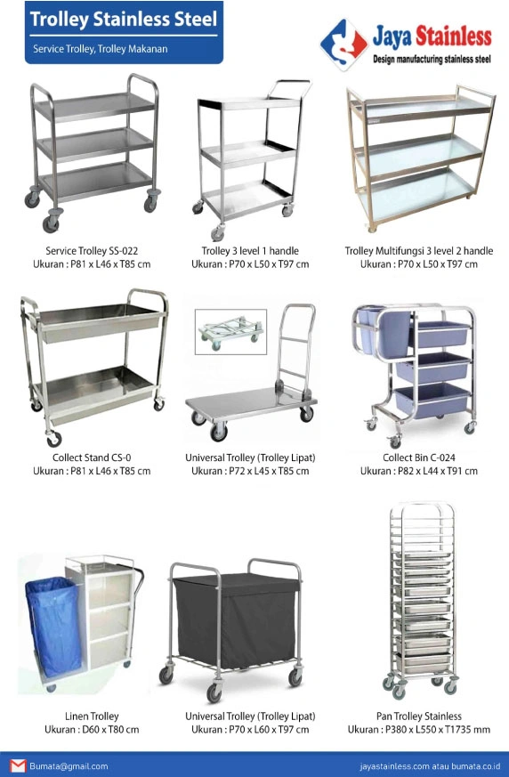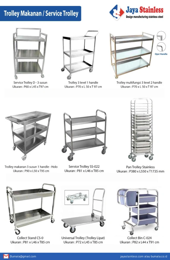 Trolley stainless steel merupakan alat yang sangat berguna dalam berbagai industri, baik itu di rumah sakit, restoran, pabrik, hingga sektor logistik. Trolley ini dirancang untuk memudahkan pengangkutan barang atau perlengkapan dalam jumlah banyak atau berat, sehingga mempercepat dan meningkatkan efisiensi operasional. Dibuat dari bahan stainless steel, trolley ini menawarkan keunggulan yang membuatnya sangat diminati di berbagai sektor.