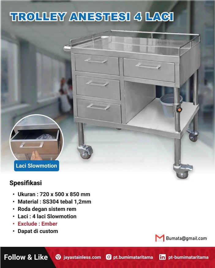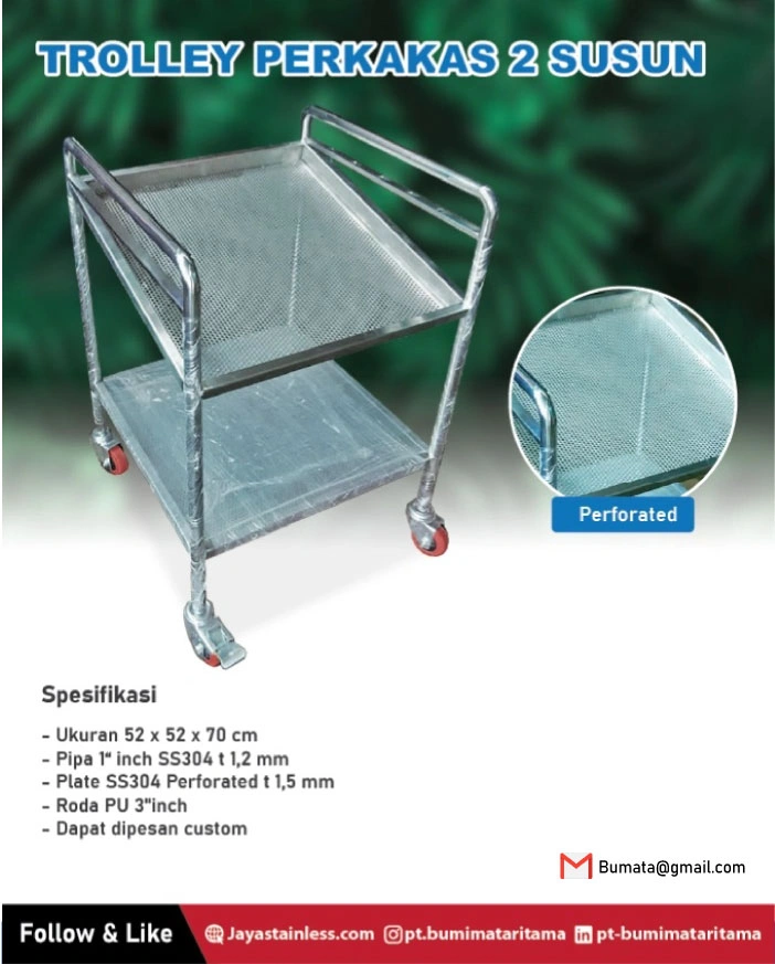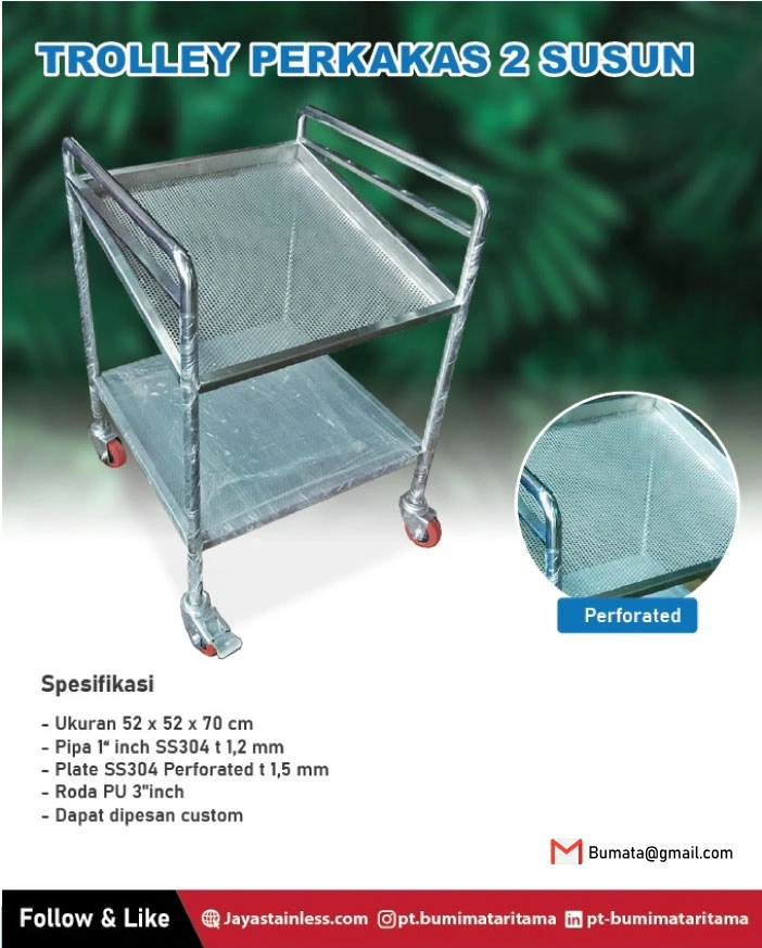 Troli stainless juga dikenal karena kekuatannya. Meskipun ringan, bahan stainless steel cukup kuat untuk menahan beban berat. Hal ini memungkinkan troli untuk digunakan dalam berbagai aplikasi, seperti membawa peralatan medis, makanan, atau barang-barang industri. Desainnya yang ergonomis dengan roda yang dapat berputar 360 derajat membuatnya mudah untuk dikendalikan dan dipindahkan, bahkan dalam ruang yang sempit sekalipun.