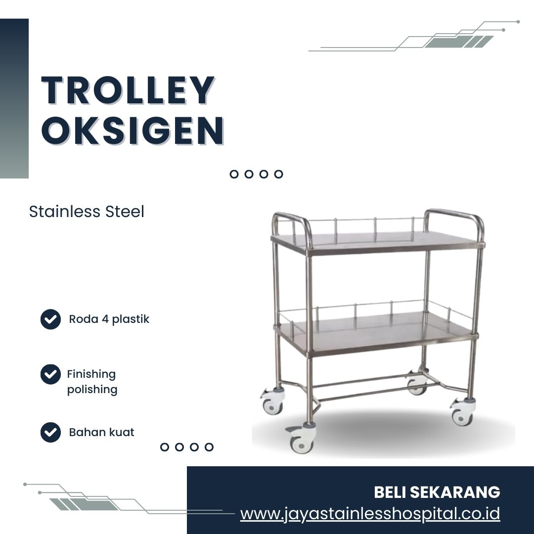 - Troli oksigen stainless steel: Tahan karat dan mudah dibersihkan, cocok untuk lingkungan yang steril.